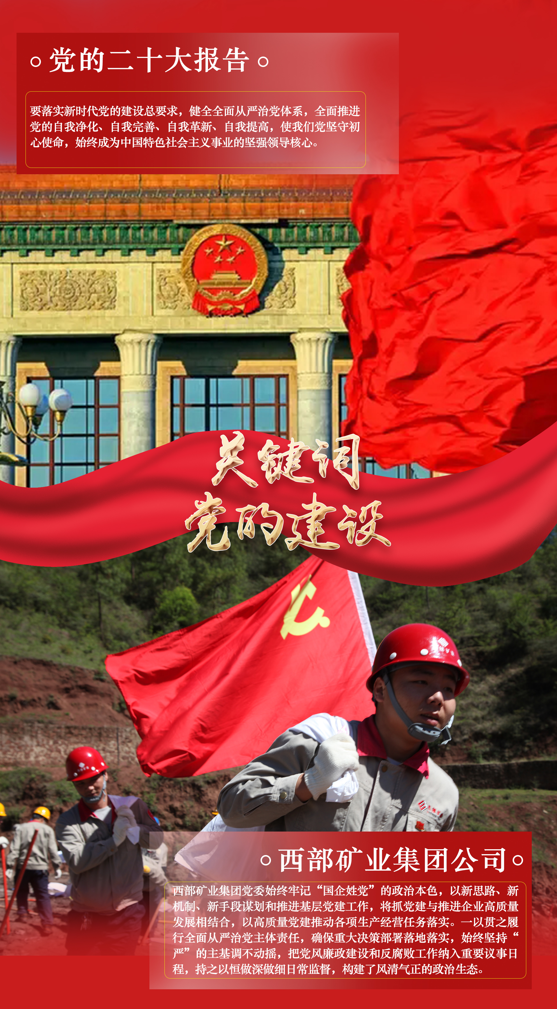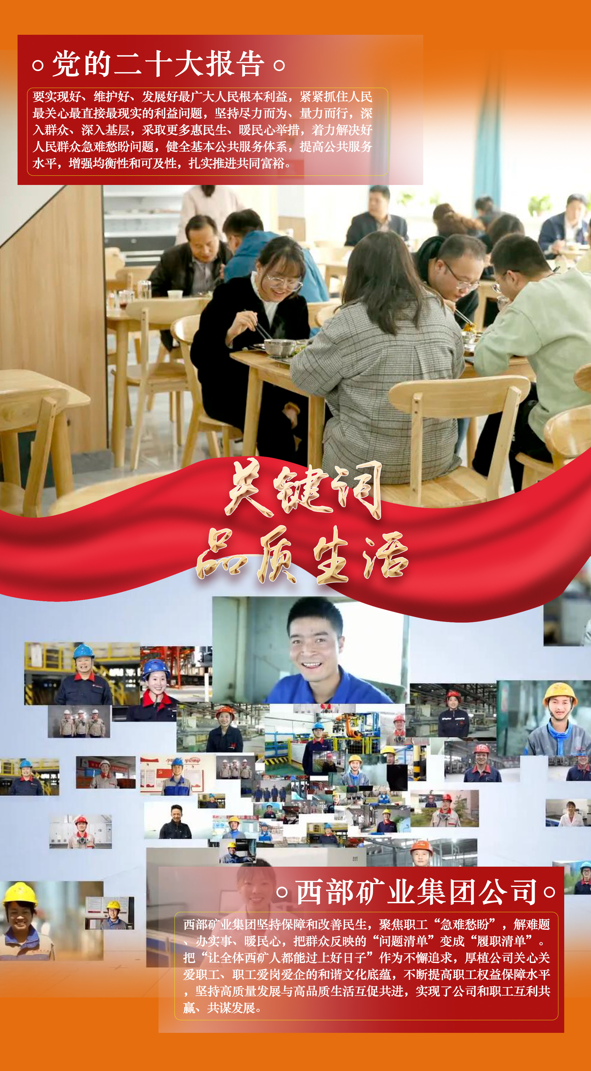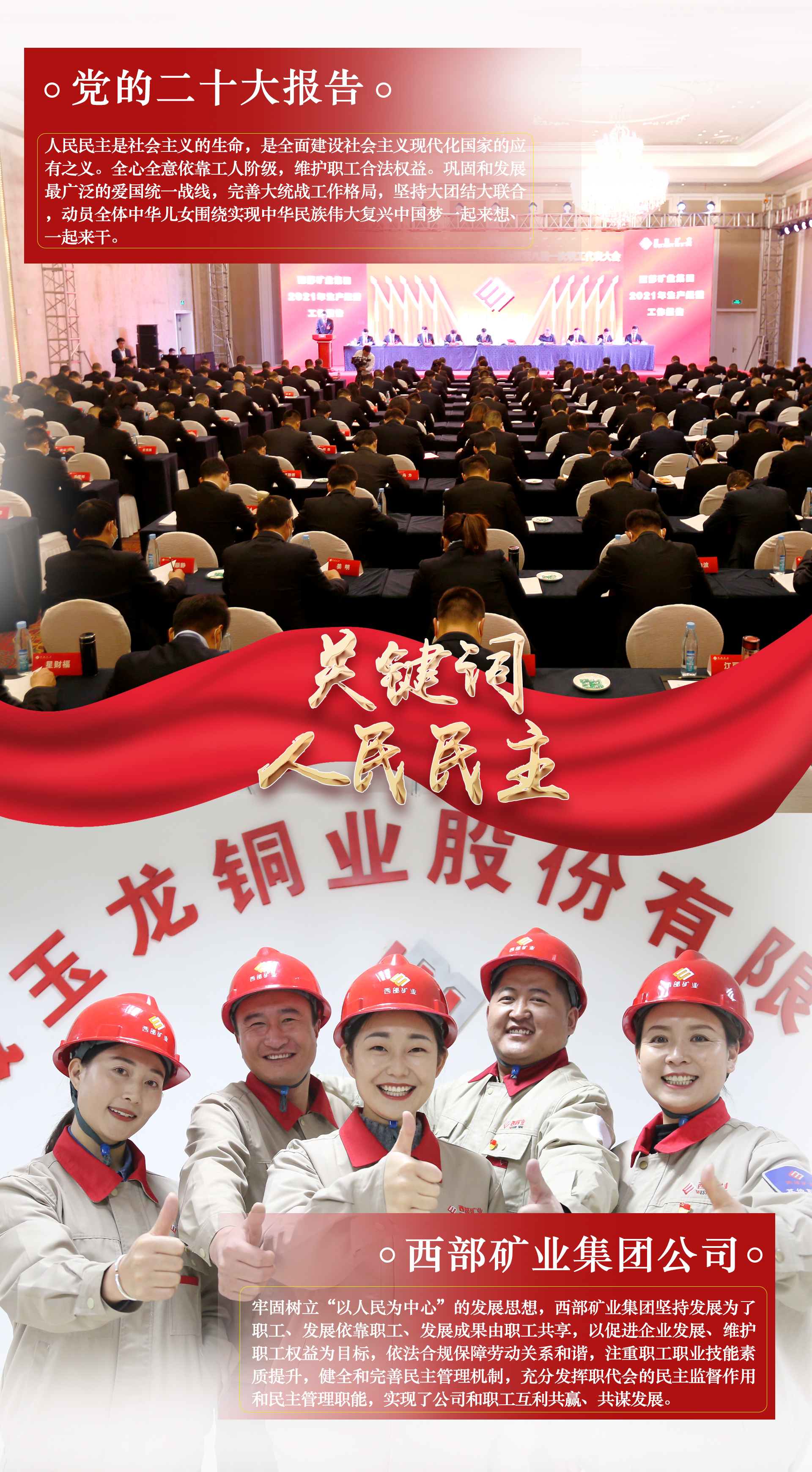 把蓝图变为现实,是一场新的长征。党的二十大报告是全面建设社会主义现代化国家新征程上的宣言书、动员令、集结号。细读报告中的这些“关键词”,无不说到了西矿人的心坎上,更加坚定了推动公司高质量发展行稳致远的信心与决心,纷纷表示要切实把思想和行动统一到党的二十大精神上来,锚定党的二十大关键词,撸起袖子加油干,用新的伟大奋斗创造新的伟业,为全面建设社会主义现代化国家、全面推进中华民族伟大复兴贡献西矿力量。本期专栏,用一组海报分享西矿人眼中的“二十大关键词”。