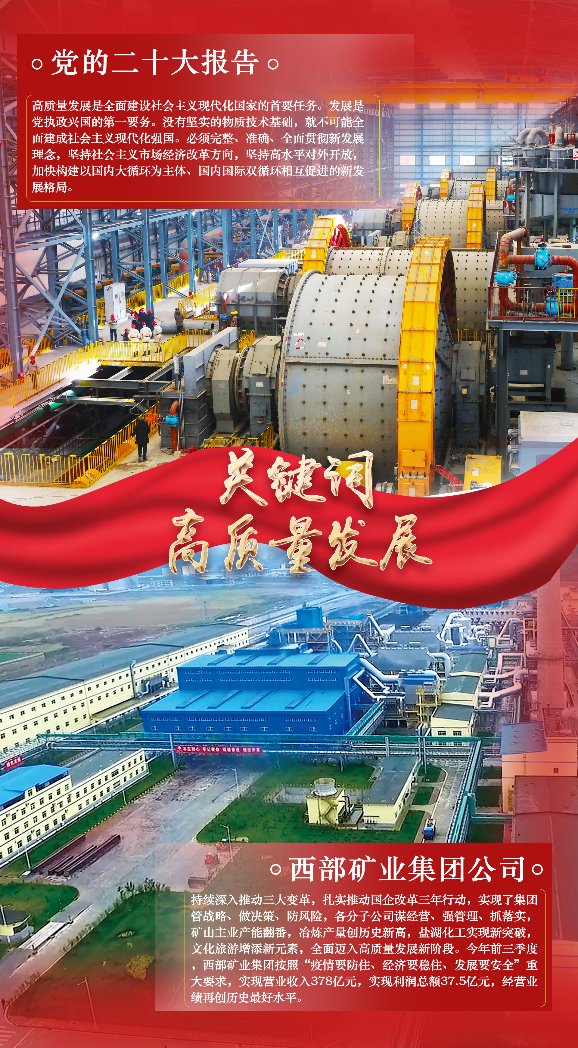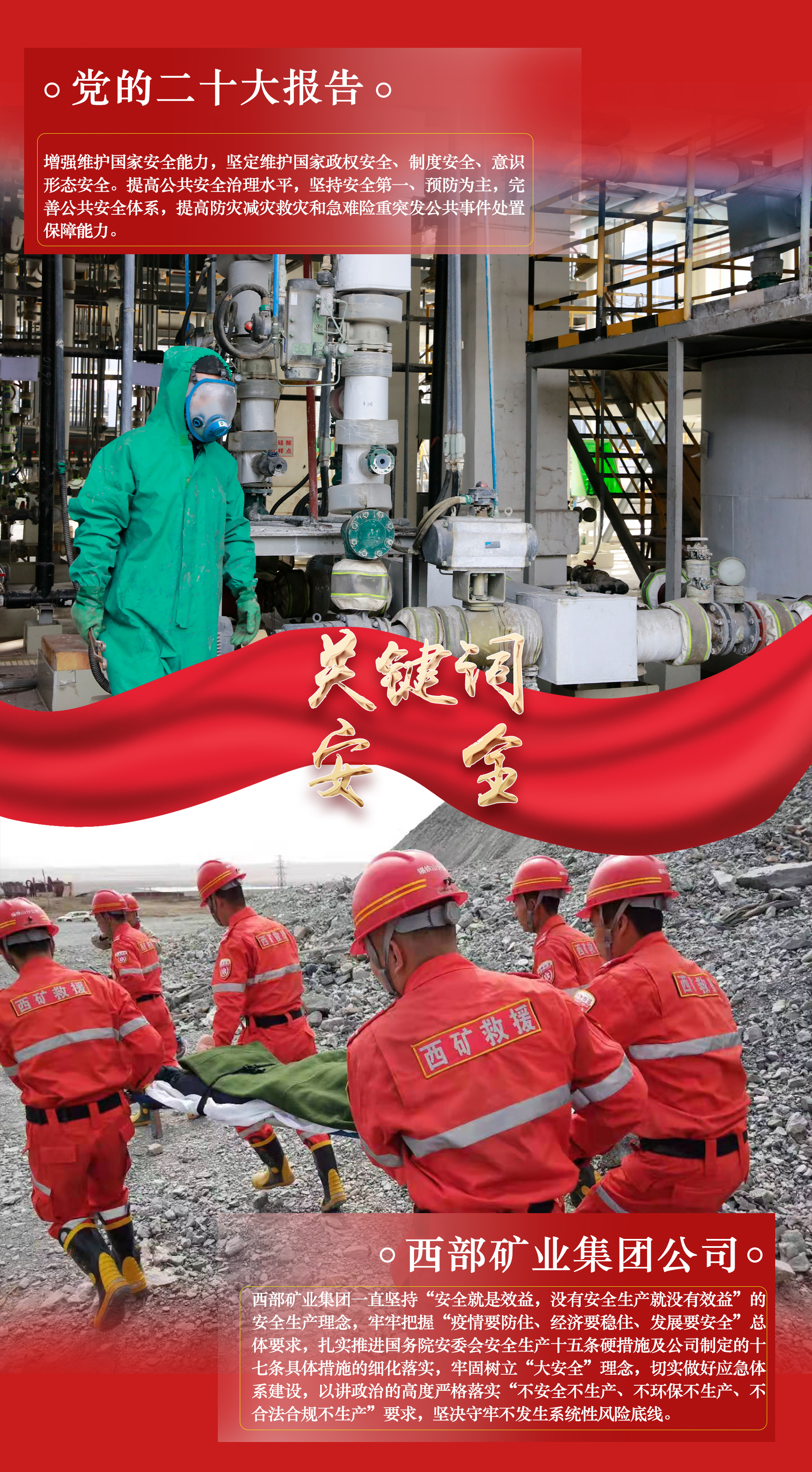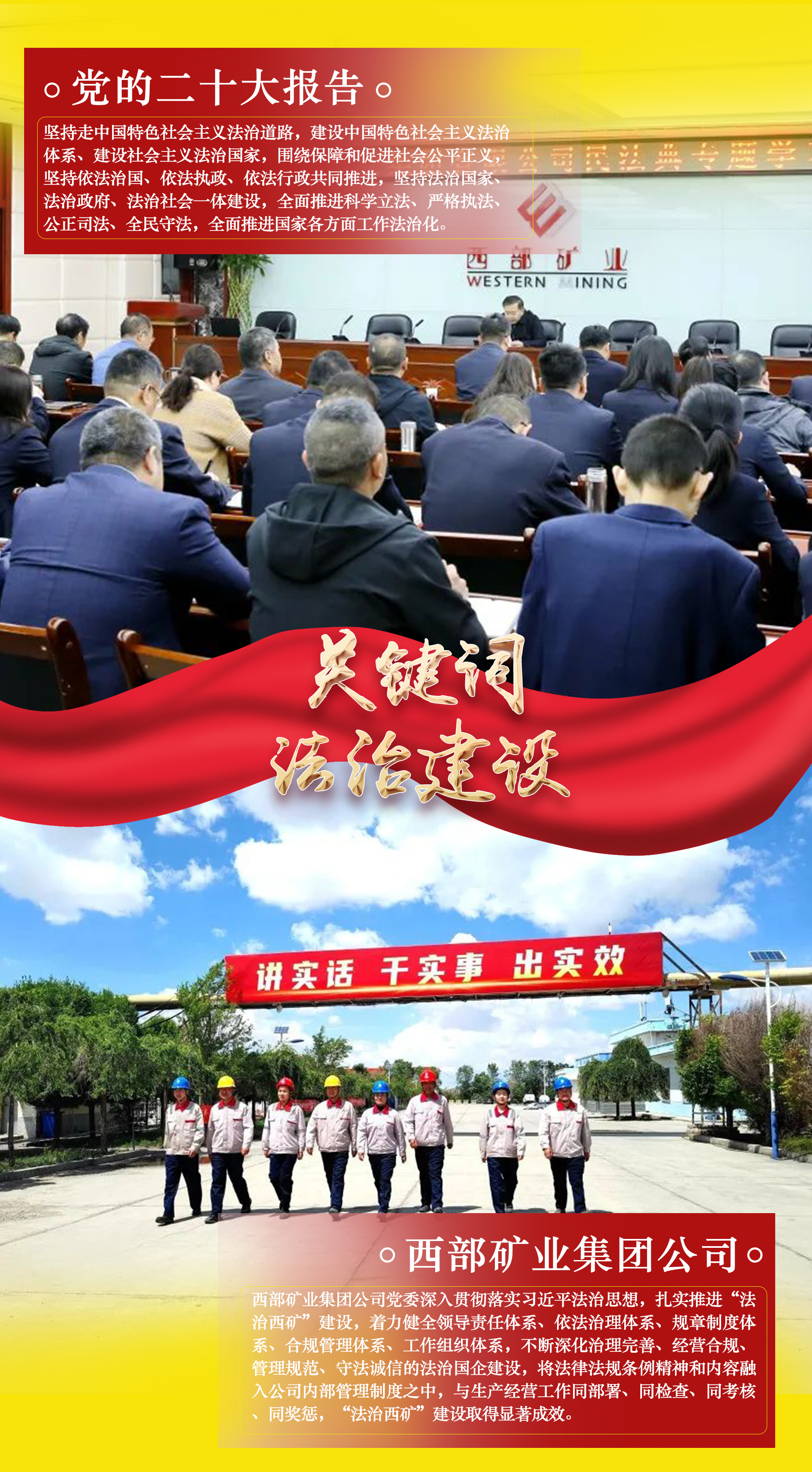 把蓝图变为现实,是一场新的长征。党的二十大报告是全面建设社会主义现代化国家新征程上的宣言书、动员令、集结号。细读报告中的这些“关键词”,无不说到了西矿人的心坎上,更加坚定了推动公司高质量发展行稳致远的信心与决心,纷纷表示要切实把思想和行动统一到党的二十大精神上来,锚定党的二十大关键词,撸起袖子加油干,用新的伟大奋斗创造新的伟业,为全面建设社会主义现代化国家、全面推进中华民族伟大复兴贡献西矿力量。本期专栏,用一组海报分享西矿人眼中的“二十大关键词”。