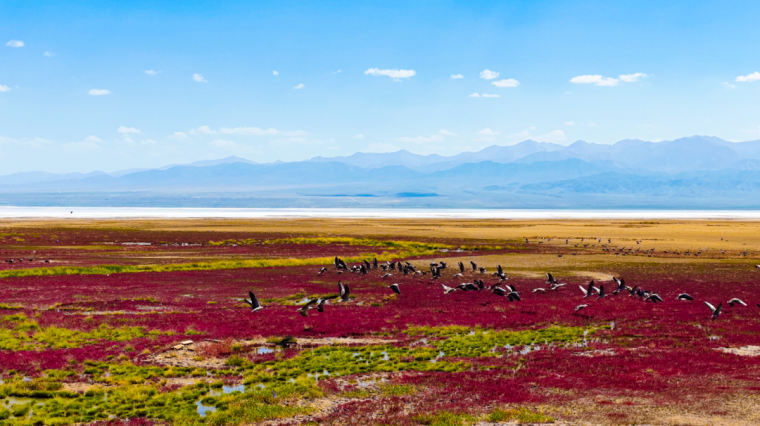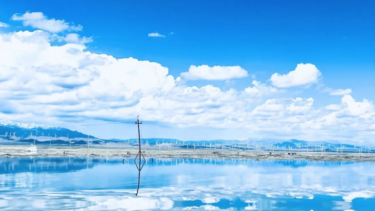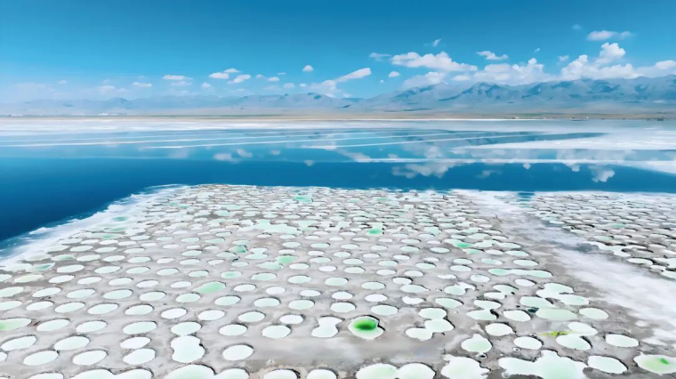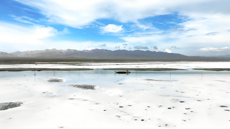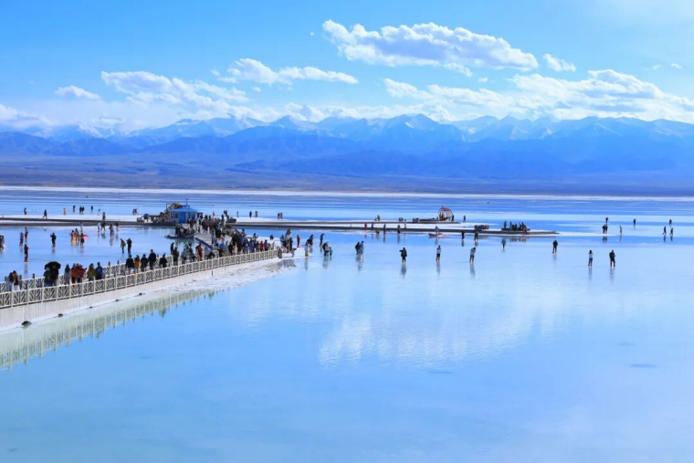 蓝色,是纯净的天空之镜。当清澈的湖水倒映着云朵和山峰,茶卡盐湖被染成静谧的蓝色,天空与湖面融为一体,如梦如幻,宛如踏入神秘的蓝色星球,水映天、天接地、人在湖间走,宛如画中游。当双刀轮采盐船从蓝调的盐湖中将粒粒大青盐采撷而出,在蓝色的湖面上,构成一幅美轮美奂的画面。