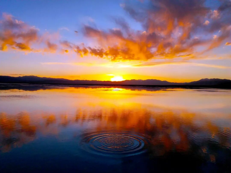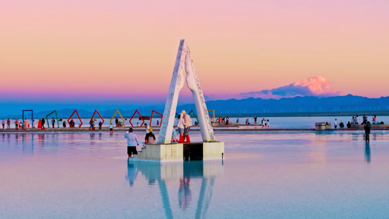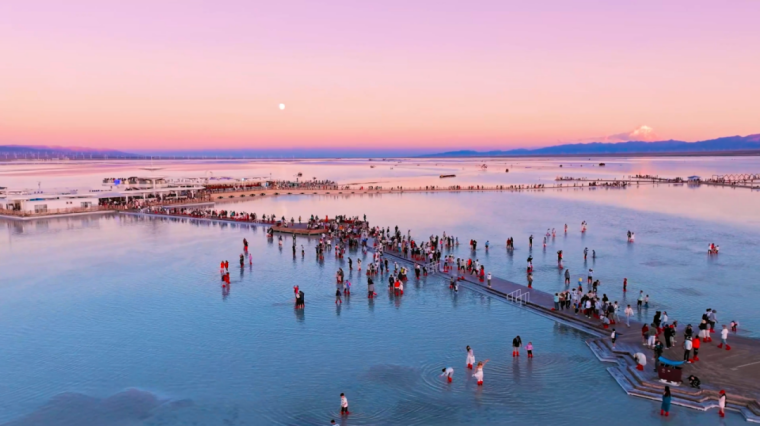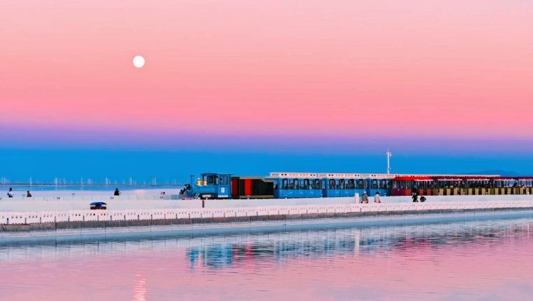 粉色,是天空赋予的景象。当太阳逐渐西沉,金色、红色余晖洒在广阔的盐湖上,湖面的折射显现粉色的天空,与正在行进的小火车构成了一幅绝美的画卷,让人不禁感叹大自然的鬼斧神工。