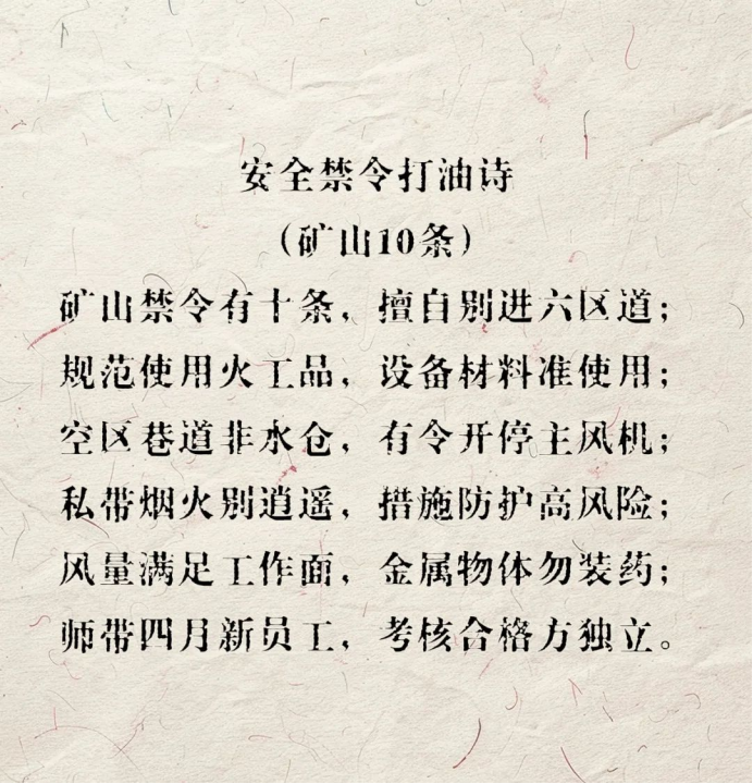 通用禁令十四条,劳保用品穿戴齐。近日,在大梁矿业井下班前会上,员工们齐声诵读安全口诀的场面成为新常态,这是大梁矿业创新推出的安全禁令及保命条款打油诗。针对传统安全培训存在内容枯燥、记忆困难的痛点,大梁矿业集思广益,将安全生产注意事项提炼成通用禁令14条+矿山禁令10条+保命条款15条三大篇章,采用押韵对仗的打油诗形式,把生硬的安全规程转化为朗朗上口的工间歌谣。下一步,公司将以6S管理提升为抓手,持续深化安全文化建设,创新安全宣教模式,积极推进禁令可视化工程,开展VR体验沉浸式教育等,让安全文化在寓教于乐中生根发芽,让人人都是安全员的理念深植于心,切实将安全禁令与保命条款转化为守护生命的坚实屏障。